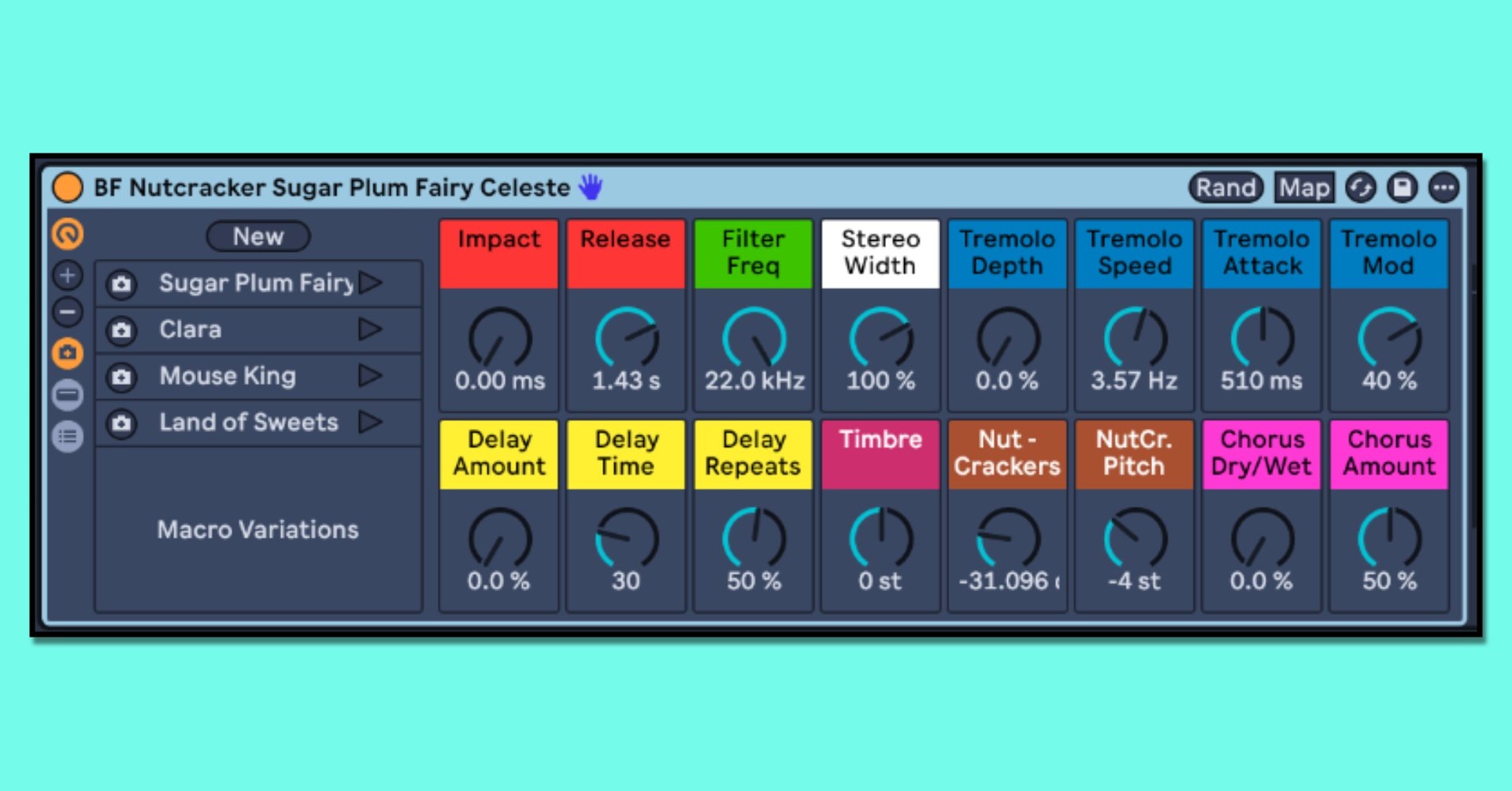 The Nutcracker Sugar Plum Fairy Celeste is an Ableton Live Instrument Rack and Drum Rack made from samples of a celeste and nutcrackers.